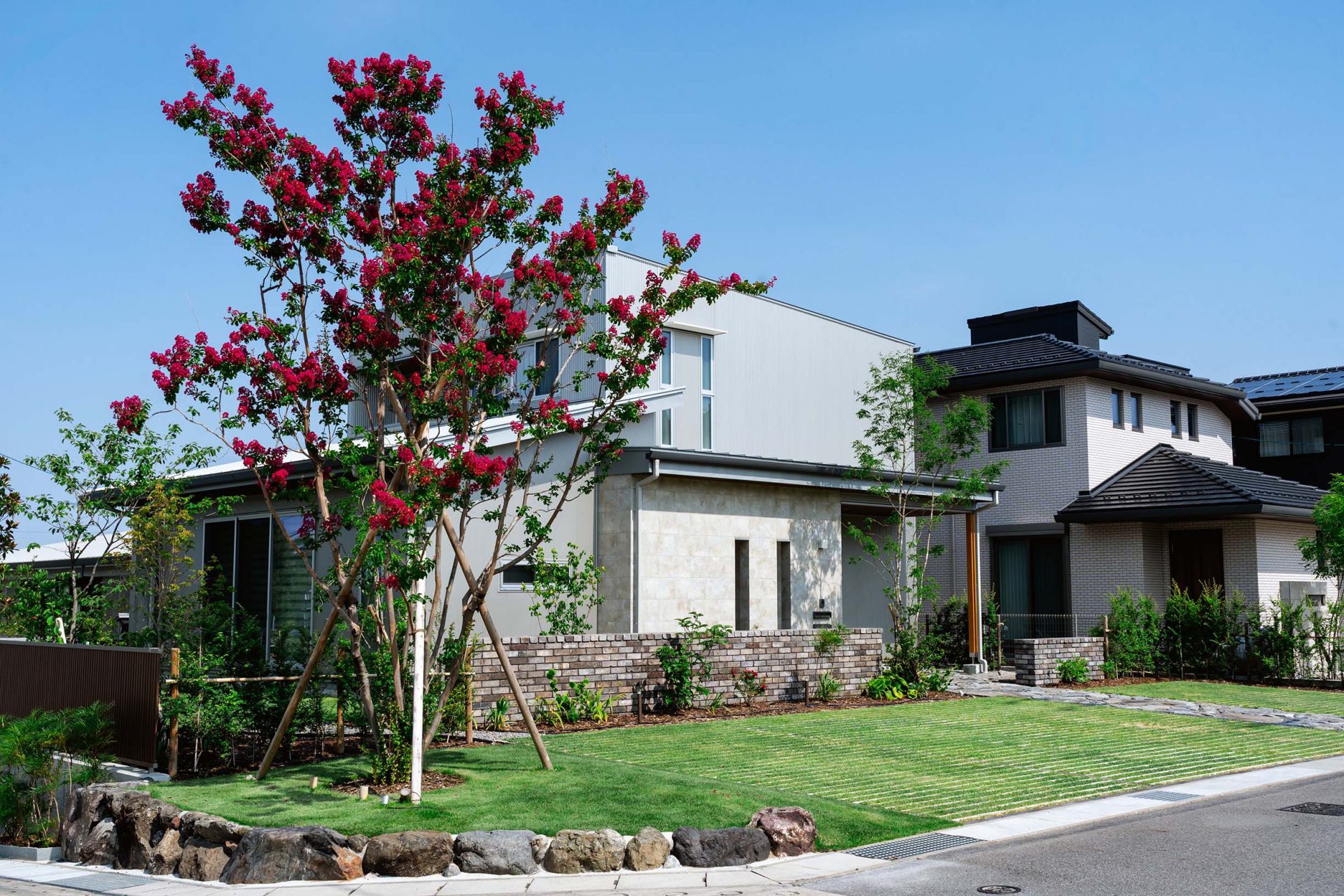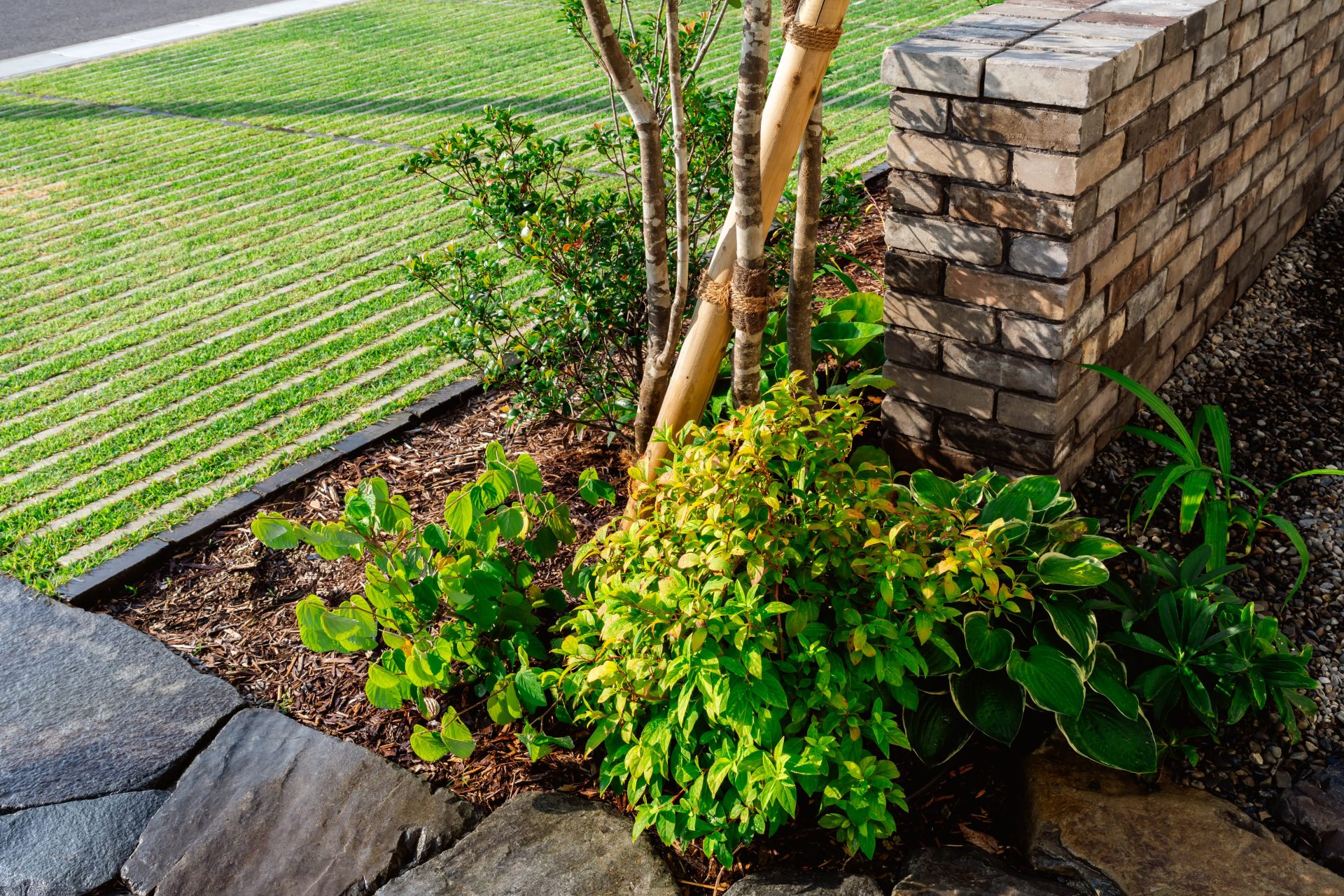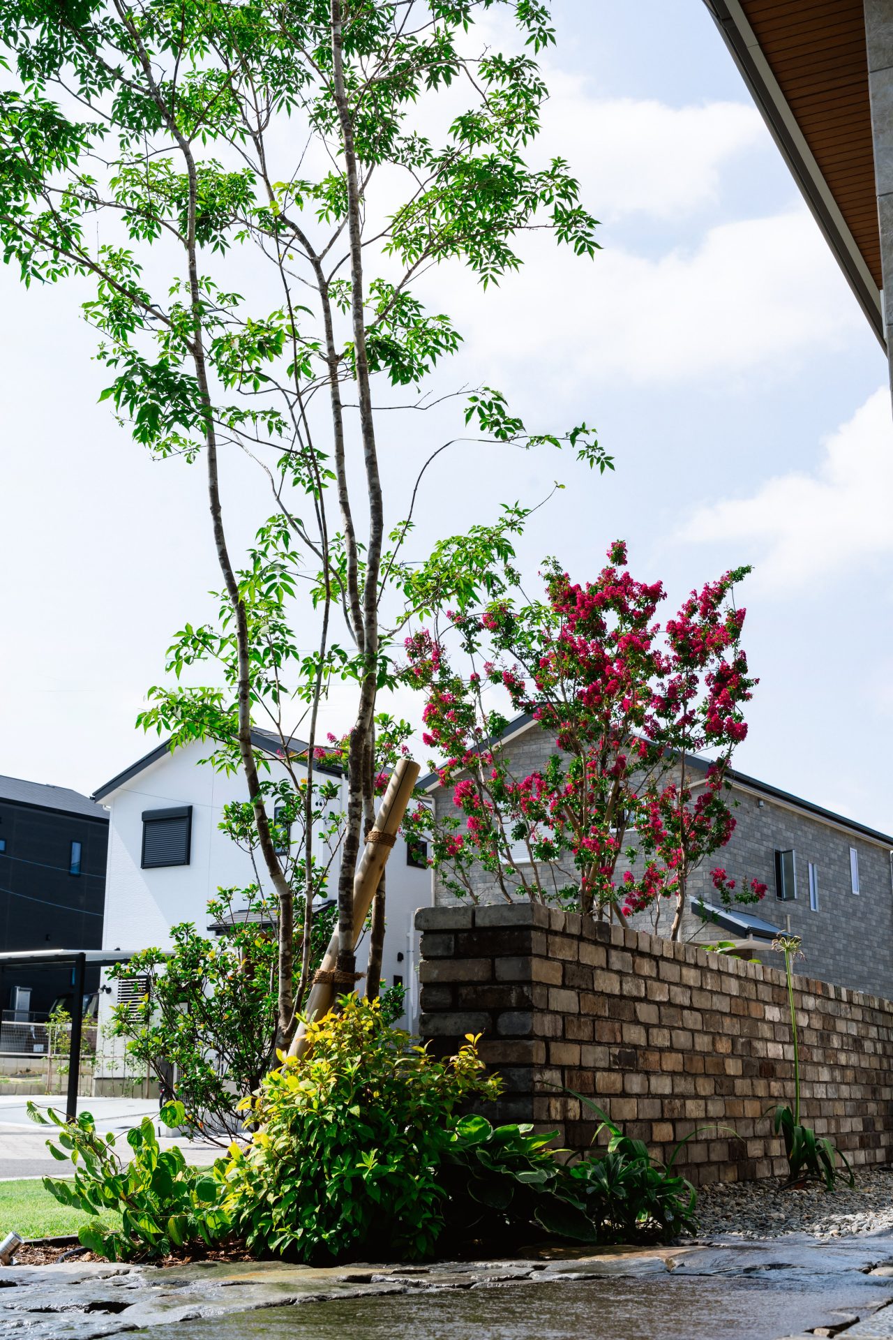 味わいあるレンガ壁と天然石のアプローチは、空間を引き締めてくれます。