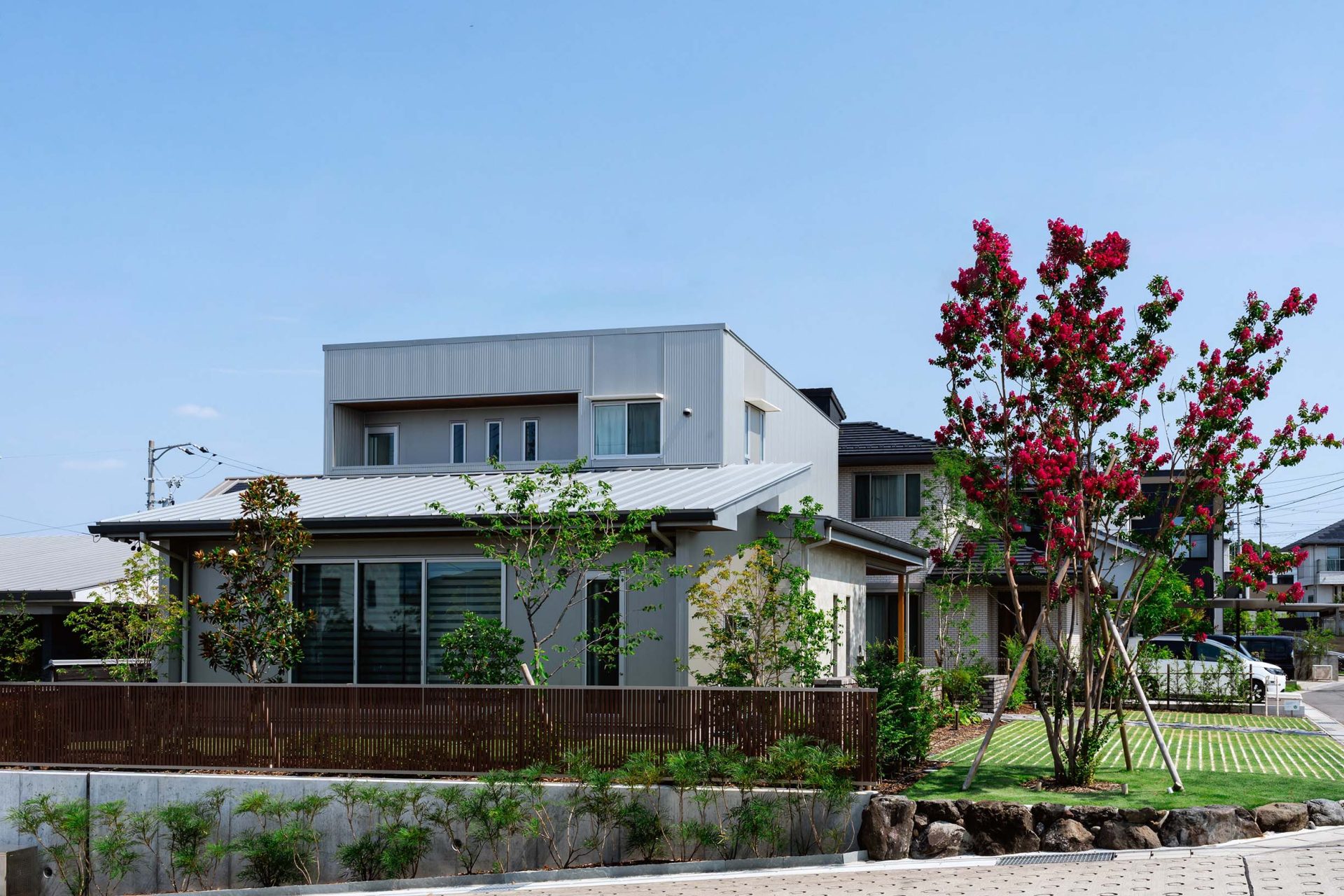 濃いピンクのサルスベリは、この家のシンボルとして、