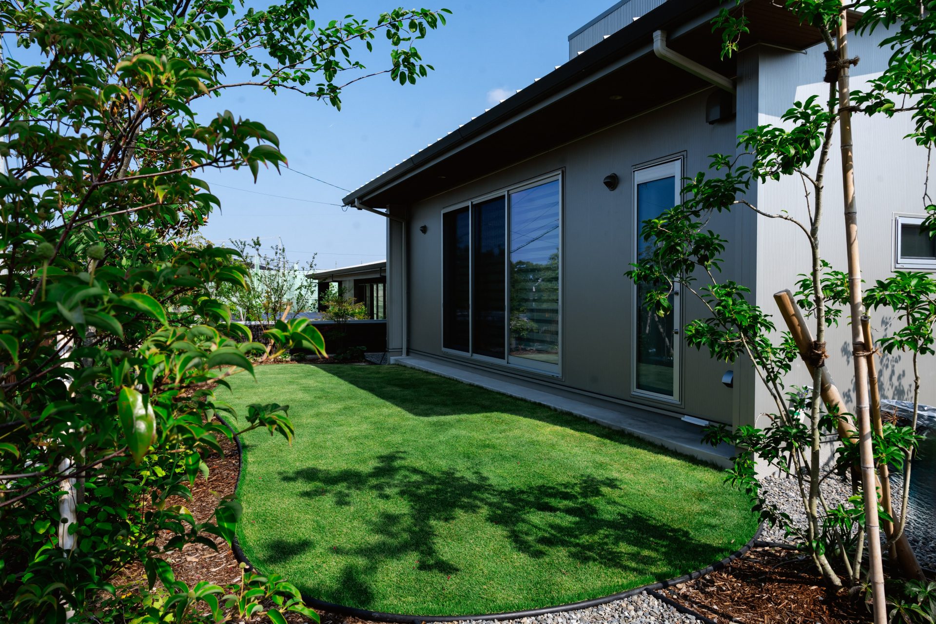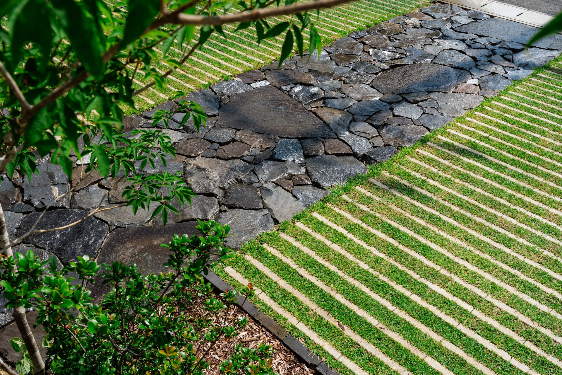 広い駐車スペースは、車がないときには庭の一部になるよう緑化ブロックを採用。